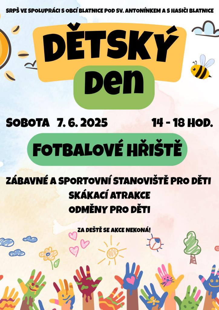 SRPŠ ve spolupráci s Obcí Blatnice pod Sv. Antonínklem a s SDH Blatnice pořádají v sobotu 7. 6. 2025 od 14 - 18 hodin na fotbalovém hřišti každoroční Dětský den. Odpoledne určené dětem: skákací atrakce, zábavné a sportovní stanoviště a odměny pro děti. Přijďte se pobavit i vy. Za deště se akce neko