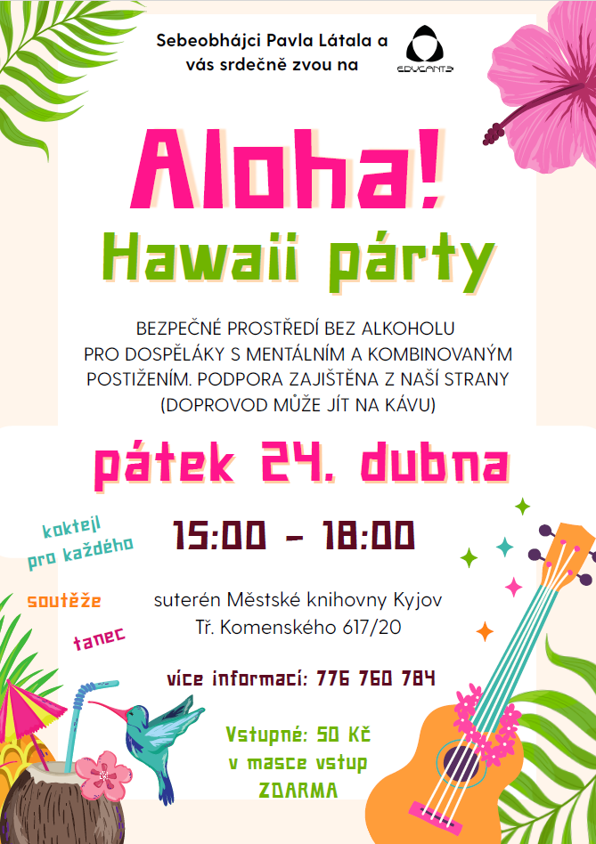 Zveme vás na Hawaii párty, která se koná v Městské knihovně Kyjov. Akce je určena pro dospělé s mentálním a kombinovaným postižením, probíhá v bezpečném prostředí bez alkoholu. Doprovod může využít čas k odpočinku u kávy. Přijďte se pobavit a užít si příjemnou atmosféru.