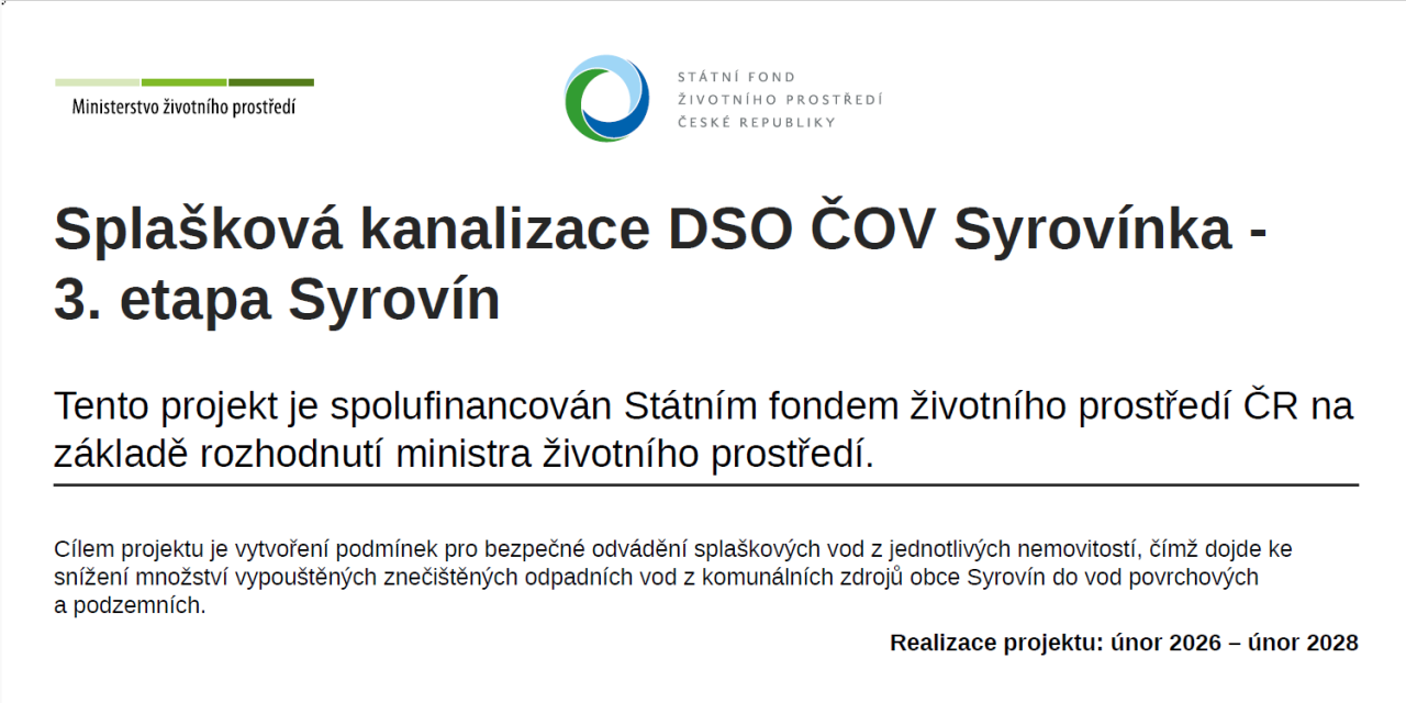 Tento projekt, který je spolufinancován Státním fondem životního prostředí ČR, přispěje ke snížení množství znečištěných odpadních vod vypouštěných z obce Syrovín. Realizace je naplánována od února 2026 do února 2028.